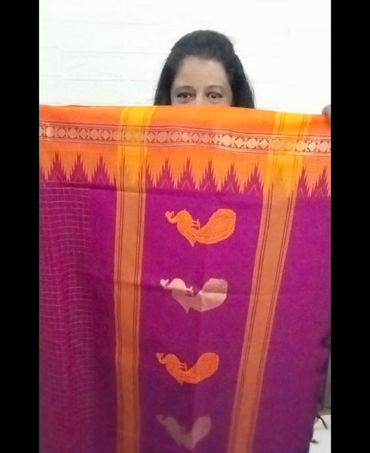 Mercerized cotton saree with tower design and peacock buttas in pallu